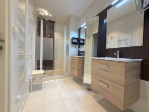 SALLE D’EAU RÉCENTE 4,8m2, avec 2 meubles vasques, douche à l’italienne, chauffe serviette