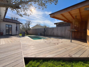 Carport, Pool house, terrasse et cuisine d’été (bois exotique y compris bardage)